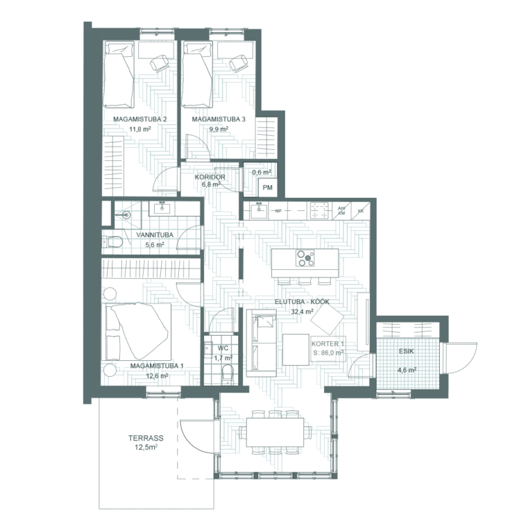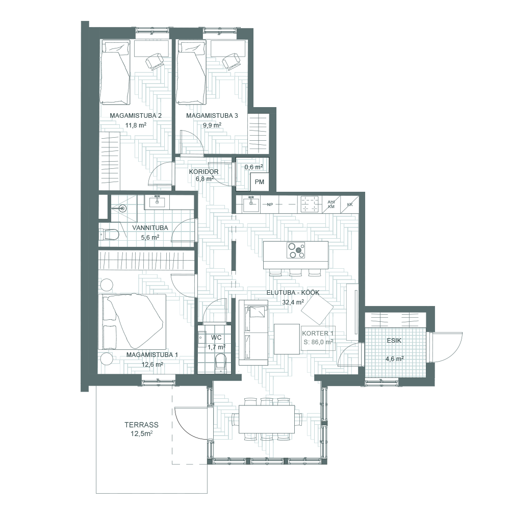 Pindala: 86 m² + terrass 12.5 m², korrus: 1