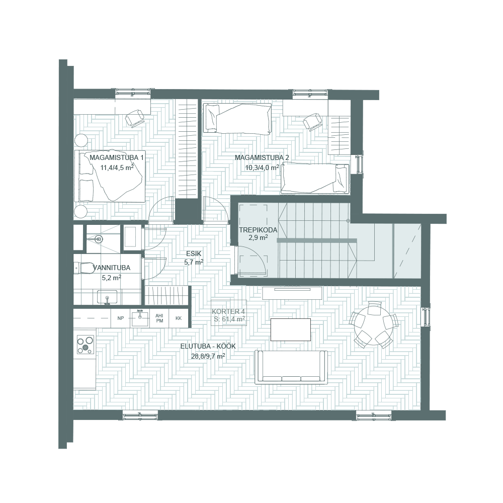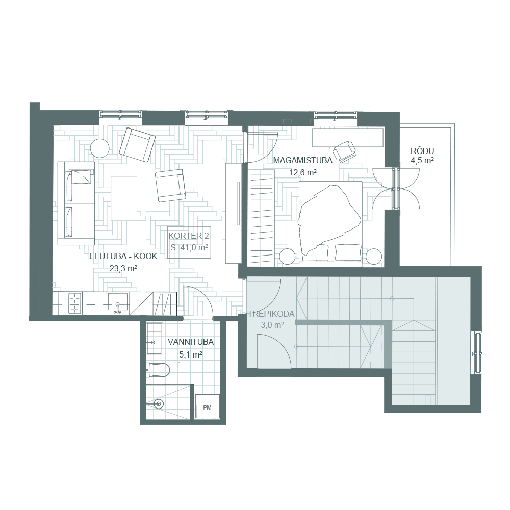 Pindala: 41 m² + rõdu 4.5 m², korrus: 2
